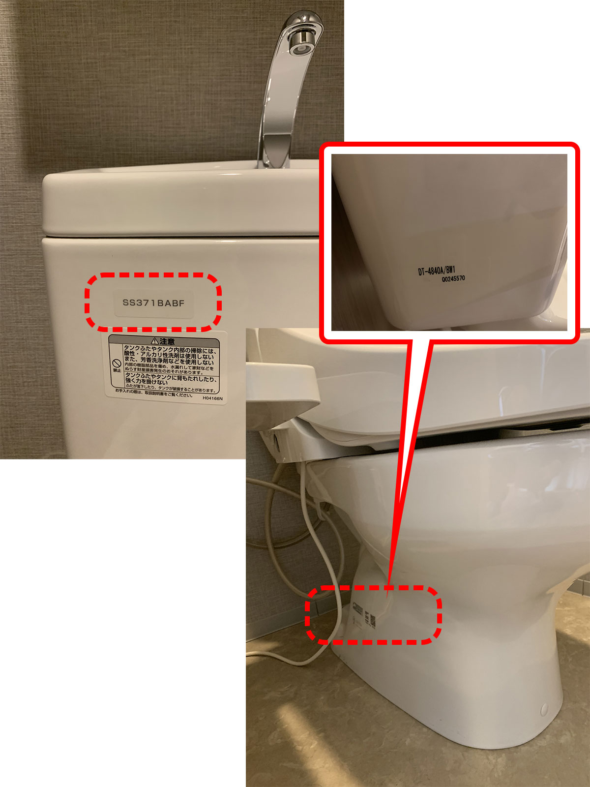 型番はタンク側面と便座足元にあります